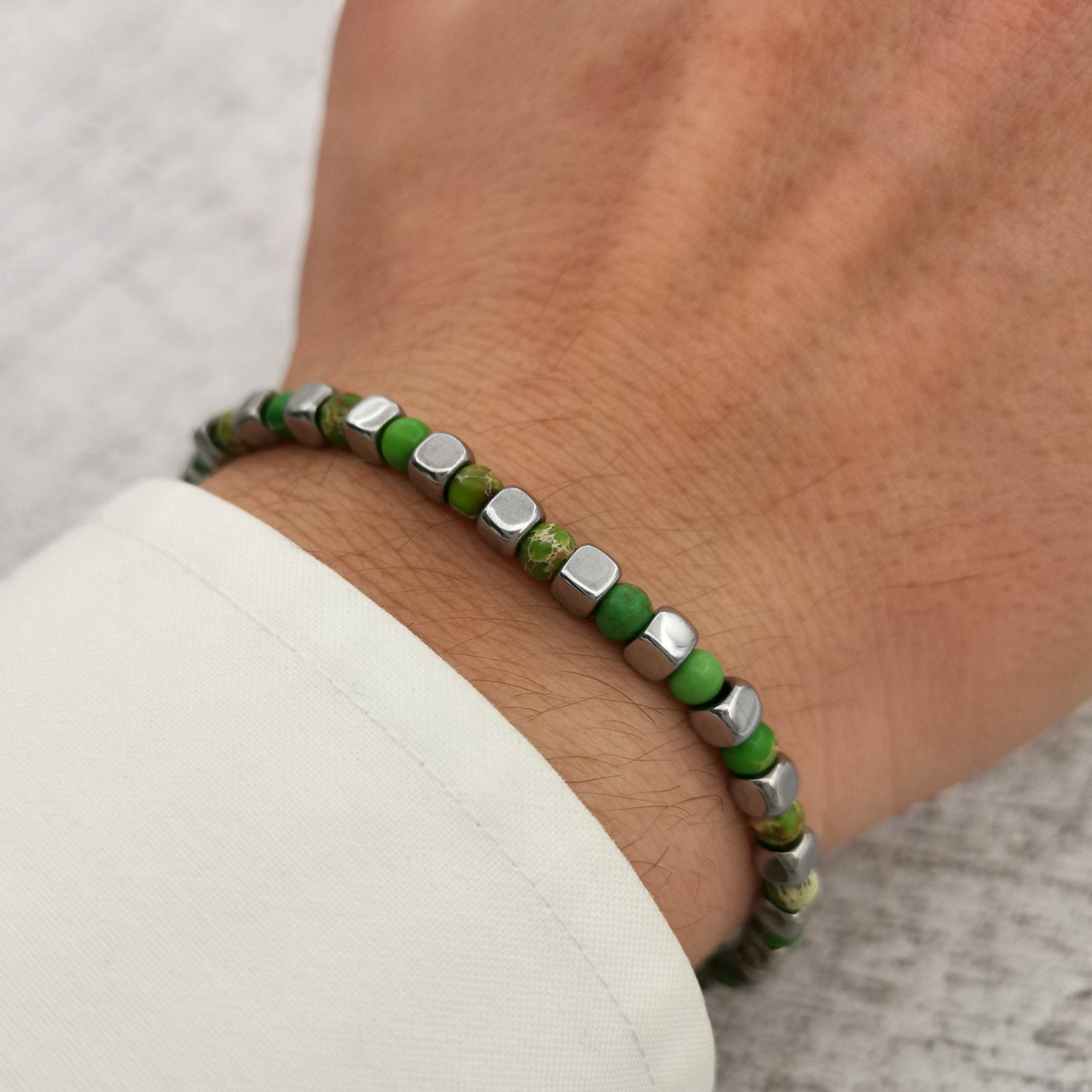 Bracciale da uomo realizzato con pietre dure di ematite e diaspro lime dal diametro di 4mm. Le perline sono attraversate da una resistente catena in acciaio. Tutte le minuterie sono realizzate in acciaio e saldate per garantire la massima resistenza.