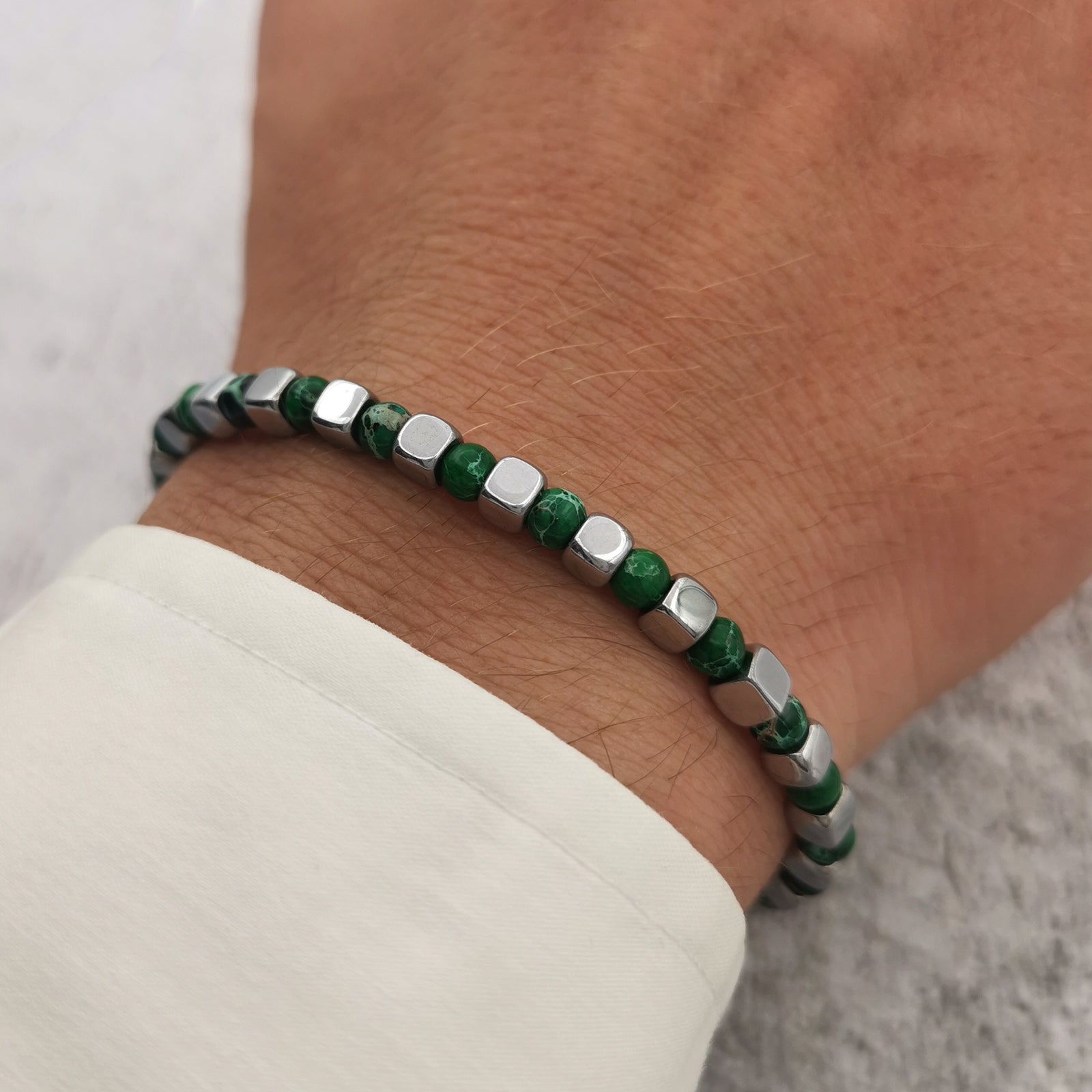 Bracciale da uomo realizzato con pietre dure di ematite e diaspro verde dal diametro di 4mm. Le perline sono attraversate da una resistente catena in acciaio. Tutte le minuterie sono realizzate in acciaio e saldate per garantire la massima resistenza.