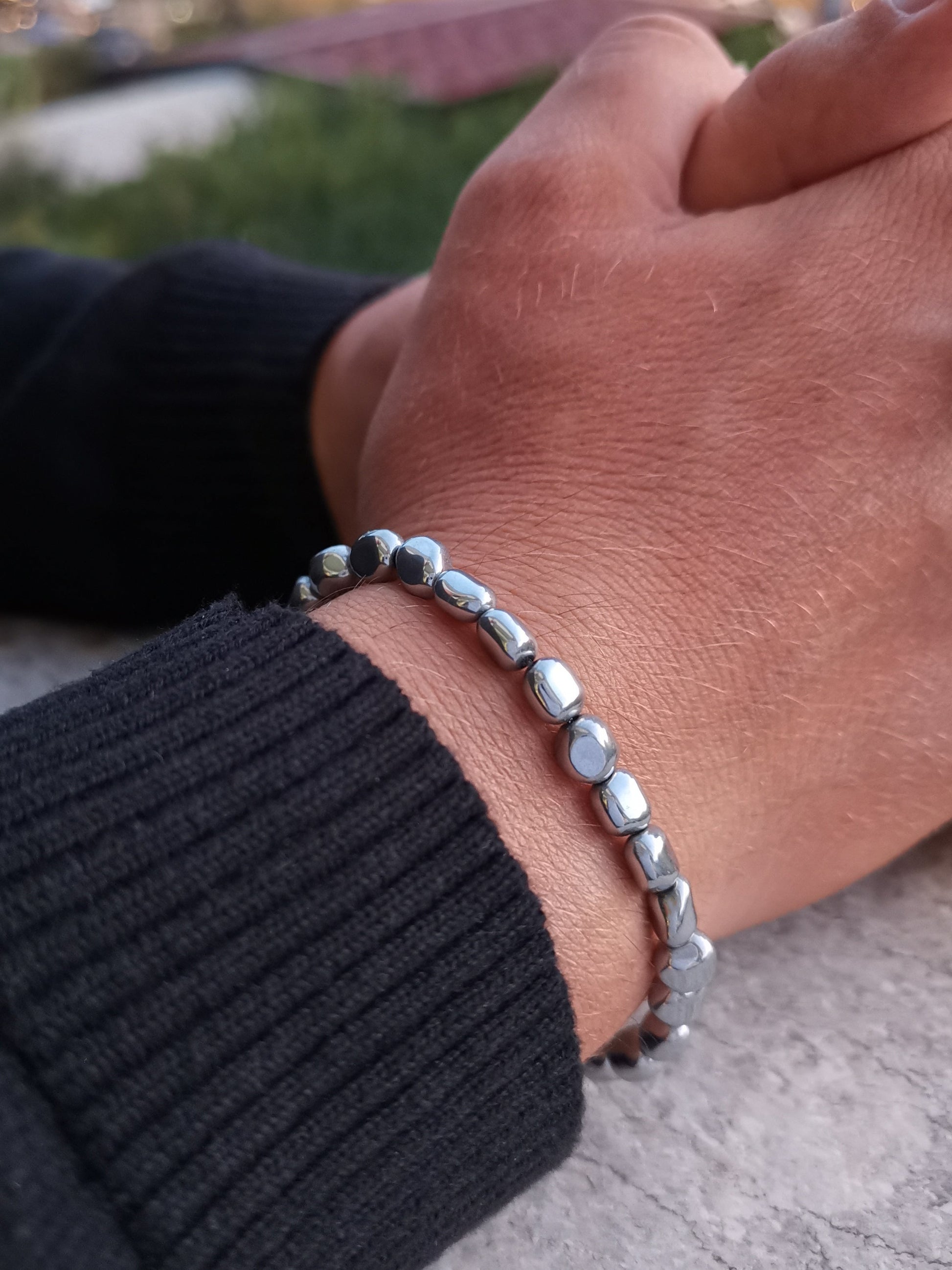 Bracciale da uomo realizzato con nuggets di ematite nella colorazione argento. Le perline sono attraversate da una resistente catena in acciaio. Tutte le minuterie sono realizzate in acciaio e saldate per garantire la massima resistenza.